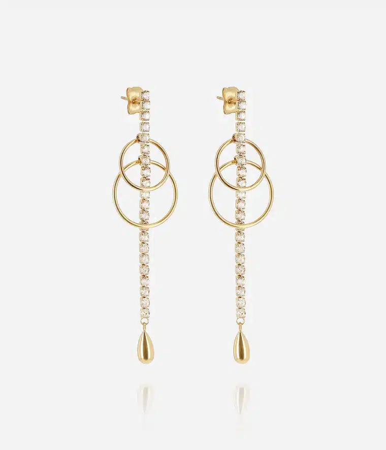 Boucles d’oreilles en acier doré à l’or fin par ionisation composées d’une tige en zirconium avec au bout une goutte en acier. Deux anneaux sont attachés autour de le tige.