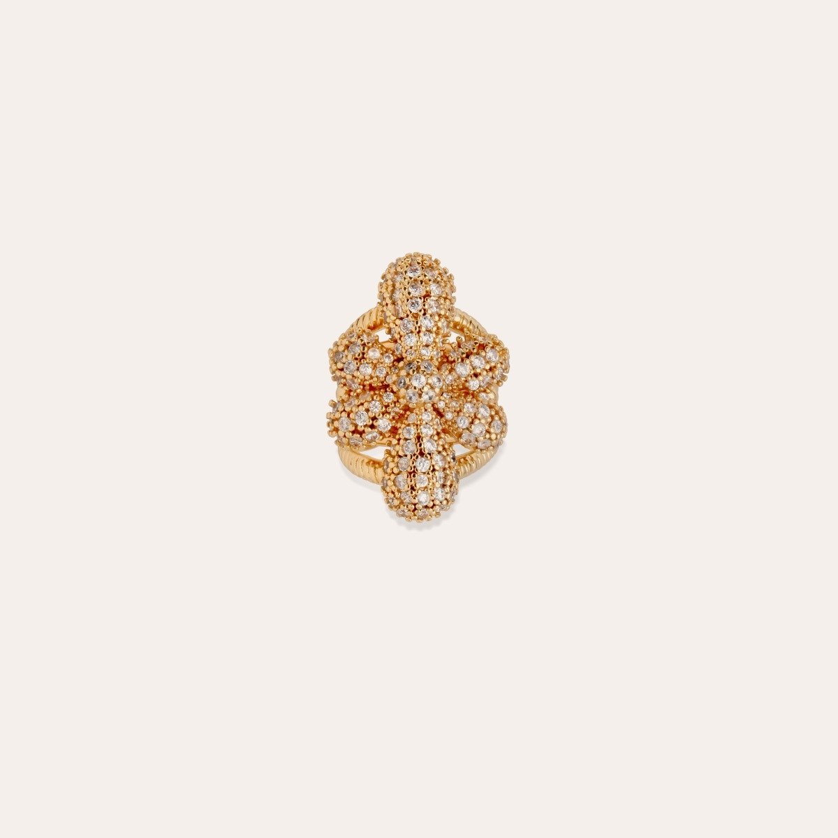 Élégante et lumineuse, cette bague dorée à l’or fin capture la lumière avec subtilité. Sa fleur en relief, finement travaillée, est sublimée par un pavage grain de zircones scintillants, ajoutant une touche d’éclat raffinée. Un bijou façonné avec soin, alliant savoir-faire artisanal et éclat.