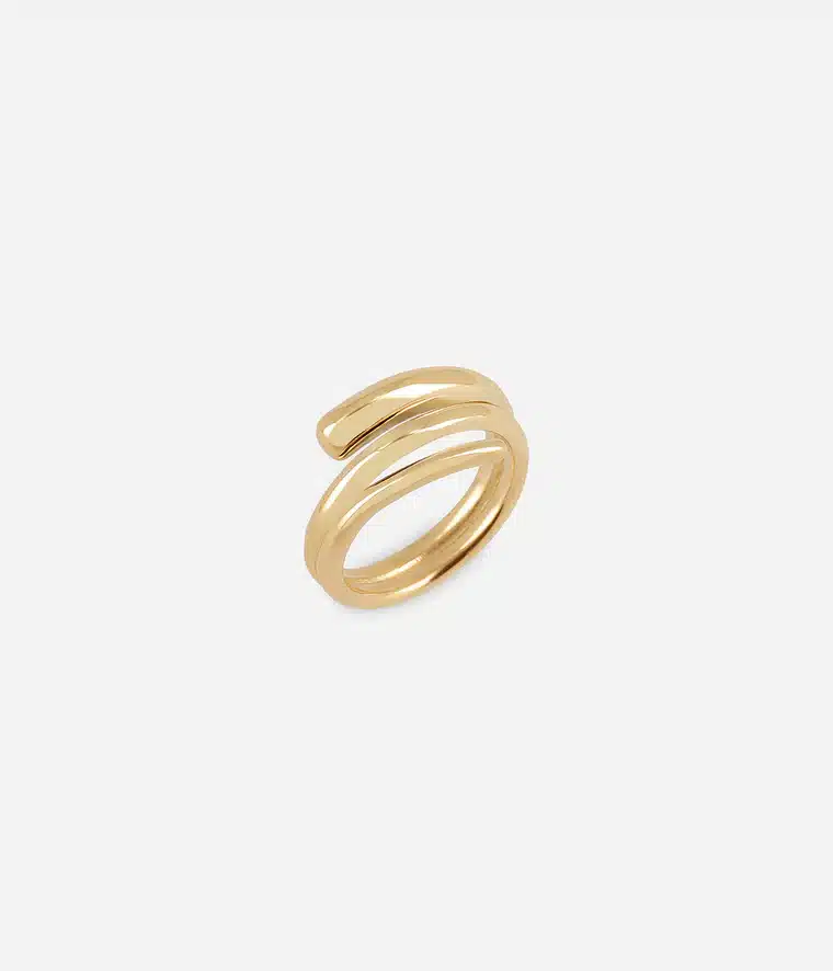 Bague en acier doré à l’or fin. Cette bague est composée de 3 anneaux arrondis superposés les uns au dessus des autres donnant un effet d’accumulation.