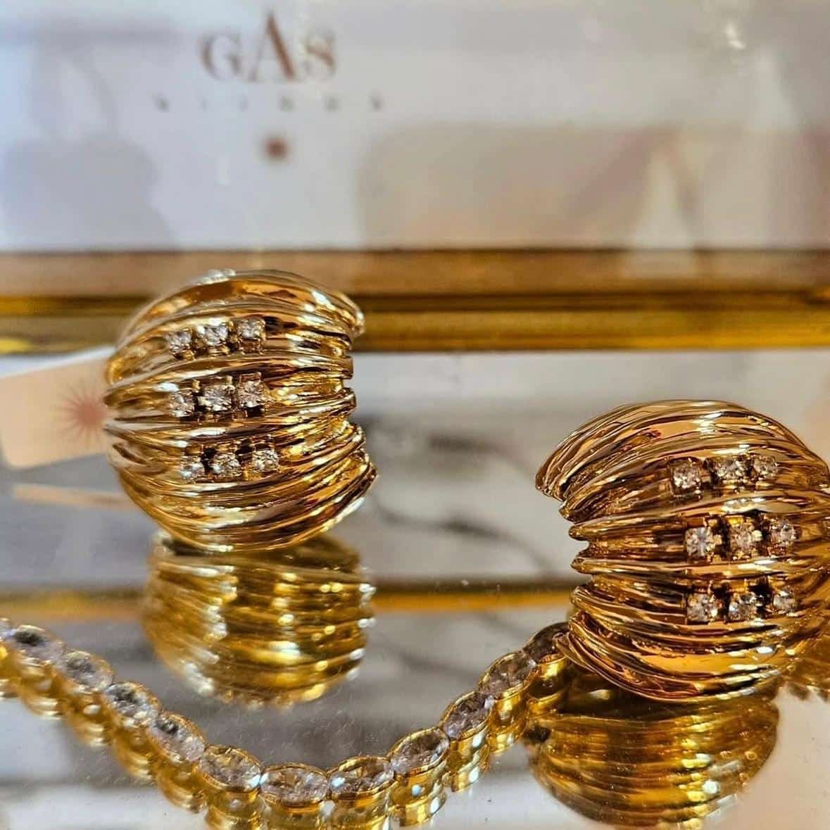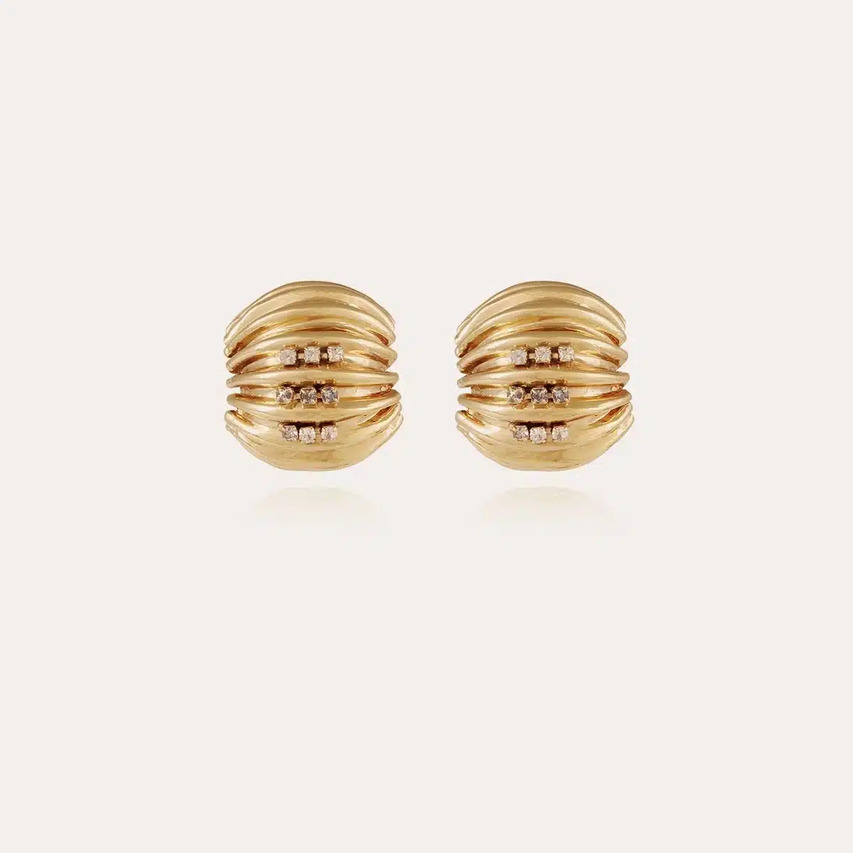 Boucles d’oreilles dorées à l’or fin, de forme bombées et striées elles sont embellies de délicats strass à l’avant.