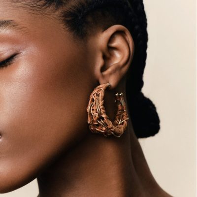 Boucles d’oreilles créoles dorées à l’or fin, composées de deux anneaux entrelacés, tressées délicatement à la main avec de l’osier et un fil métallique.