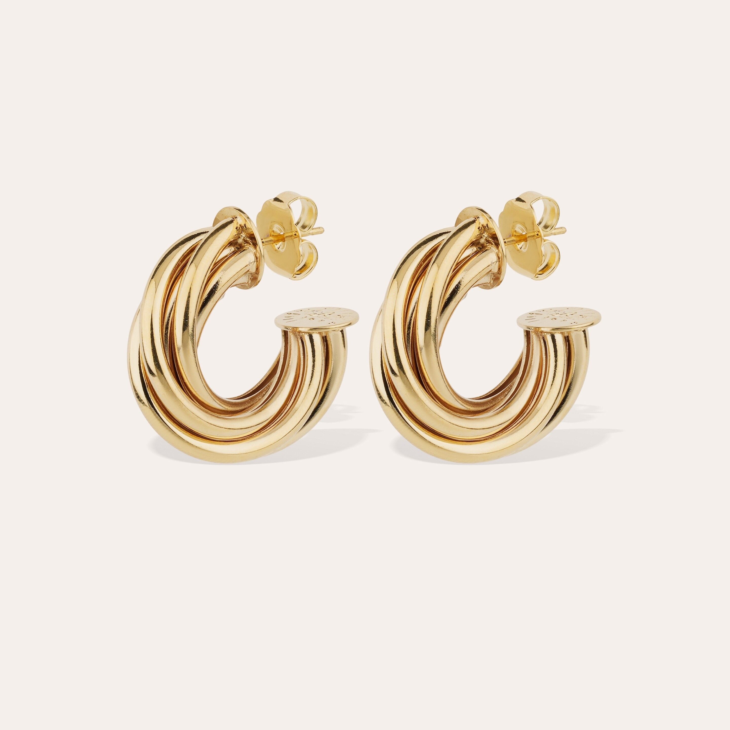 Boucles d’oreilles dorées à l’or fin, constituées de 6 anneaux superposés et entrelacés donnant forme à une créole.