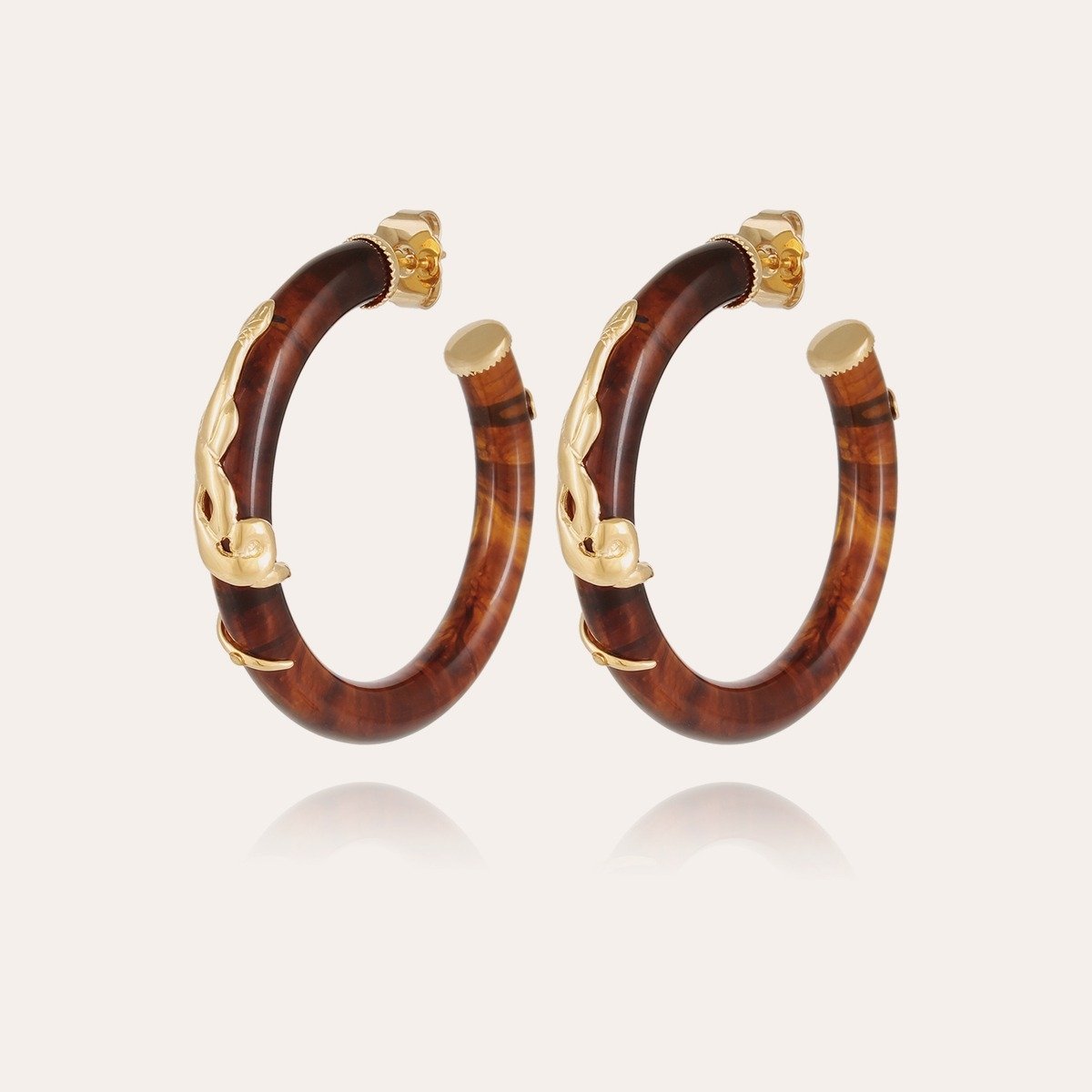 Boucles d’oreilles en acétate délicatement poli à la main, finement habillées d’un serpent doré à l’or fin. Comme un clin d’œil à « Out of Africa », la collection Safari nous plonge dans un univers tribal chic.
