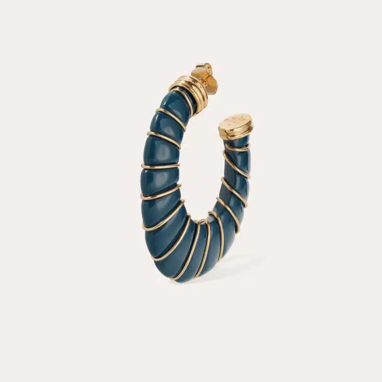 Boucles d’oreilles en résine polie à la main, inspirées du délicat mouvement des vagues. Elles sont habillées d’un fil doré à l’or fin.