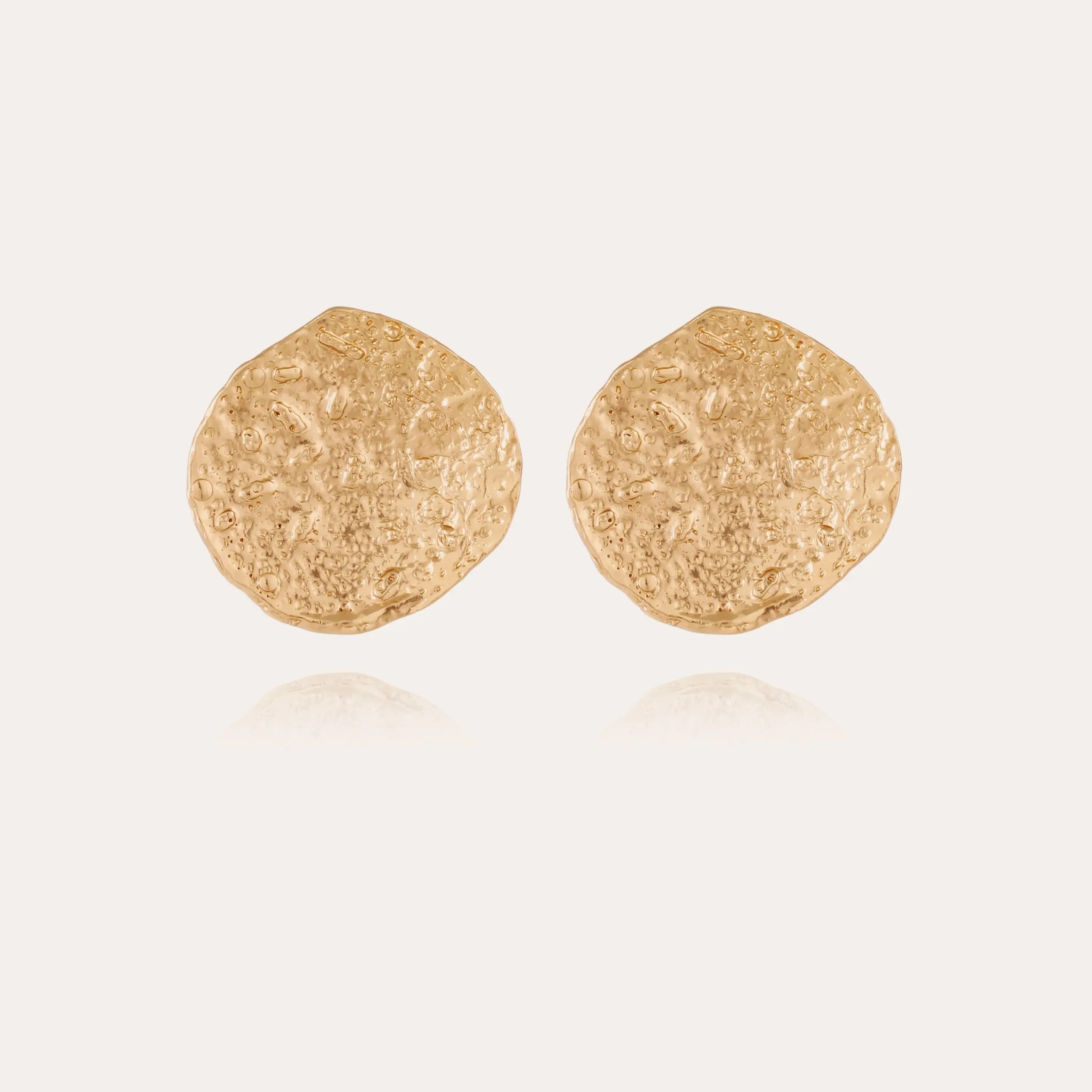 Boucles d’oreilles Eclipse Moon dorées à l’or fin, inspirées de la surface de la lune, composées d’un rond irrégulier délicatement martelés réalisés par un artisan. Une collection aux formes singulières où l’irrégularité crée le charme.