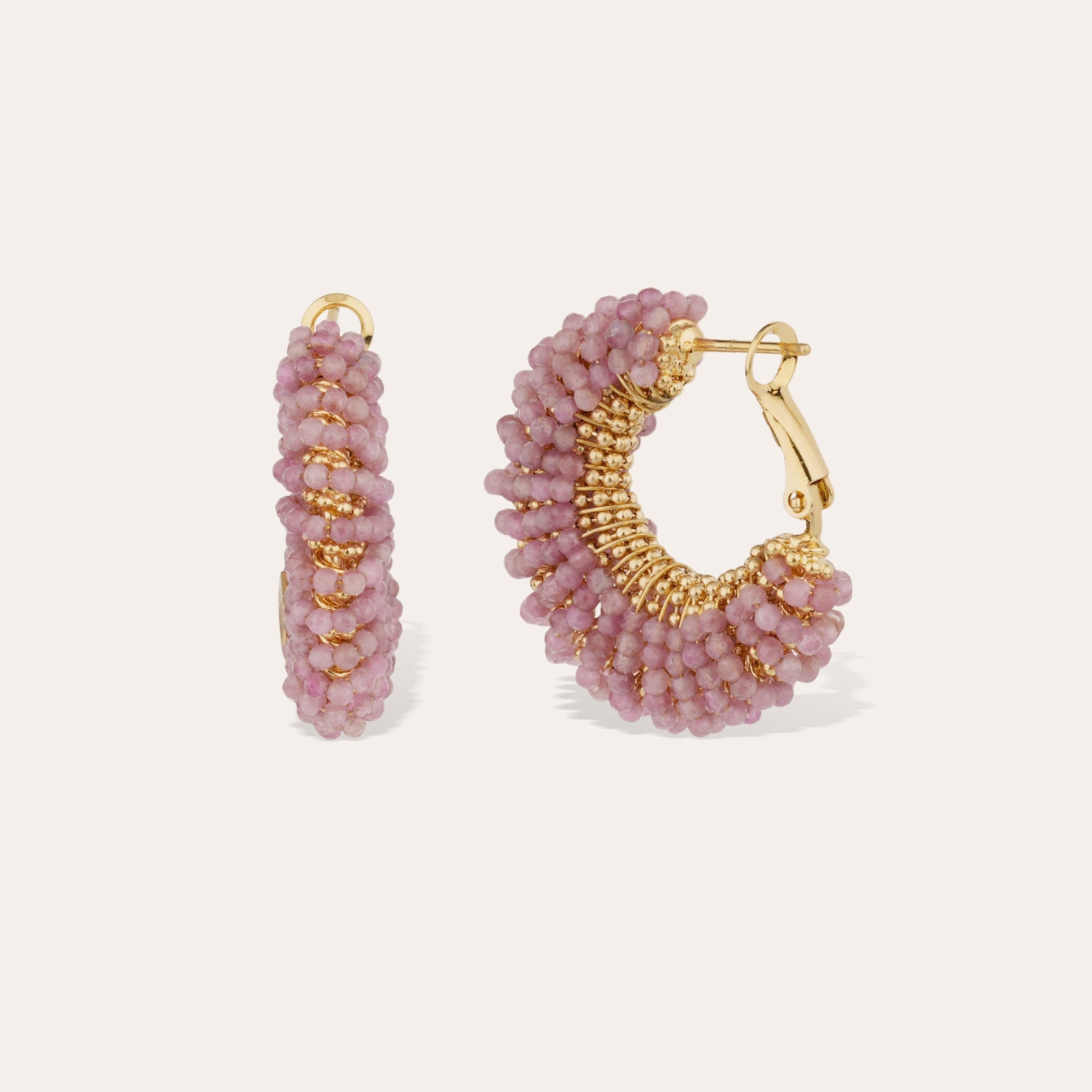 Créoles dorées à l’or fin, issues de notre collection Izzia. Elles sont composées d’un fil habillé de délicates perles de pierres fines colorées qui entoure finement toute la structure de la boucle d’oreille. Elles sont réalisées à la main dans notre atelier à Marseille. Diamètre : 3 cm Poids (par boucle d’oreille) : 6 g