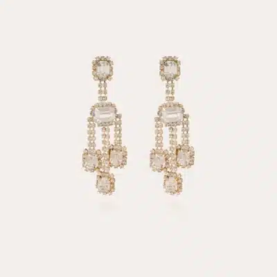 La création Léonore s’inspire de l’élégance baroque en cascade de strass cristaux, elle est articulée pour offrir un mouvement scintillant. Les boucles d’oreilles sont dorées à l’or fin, composées de cabochon minutieusement serti griffe, réalisé à la main par nos artisans.