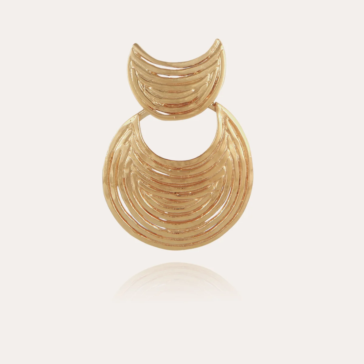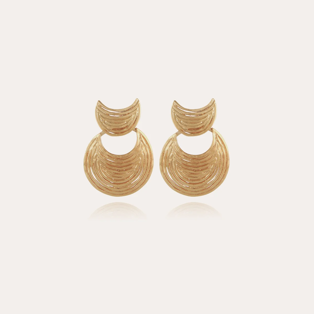 Boucles d’oreilles dorées à l’or fin finement travaillées en forme de spirale martelée à la main.