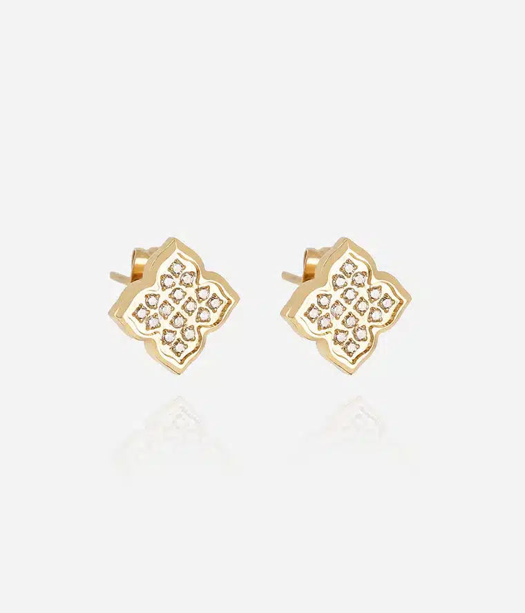 Boucles d’oreilles en acier doré à l’or fin par ionisation serti d’une pastille en forme de fleur en acier sur laquelle sont sertis plusieurs zirconiums.