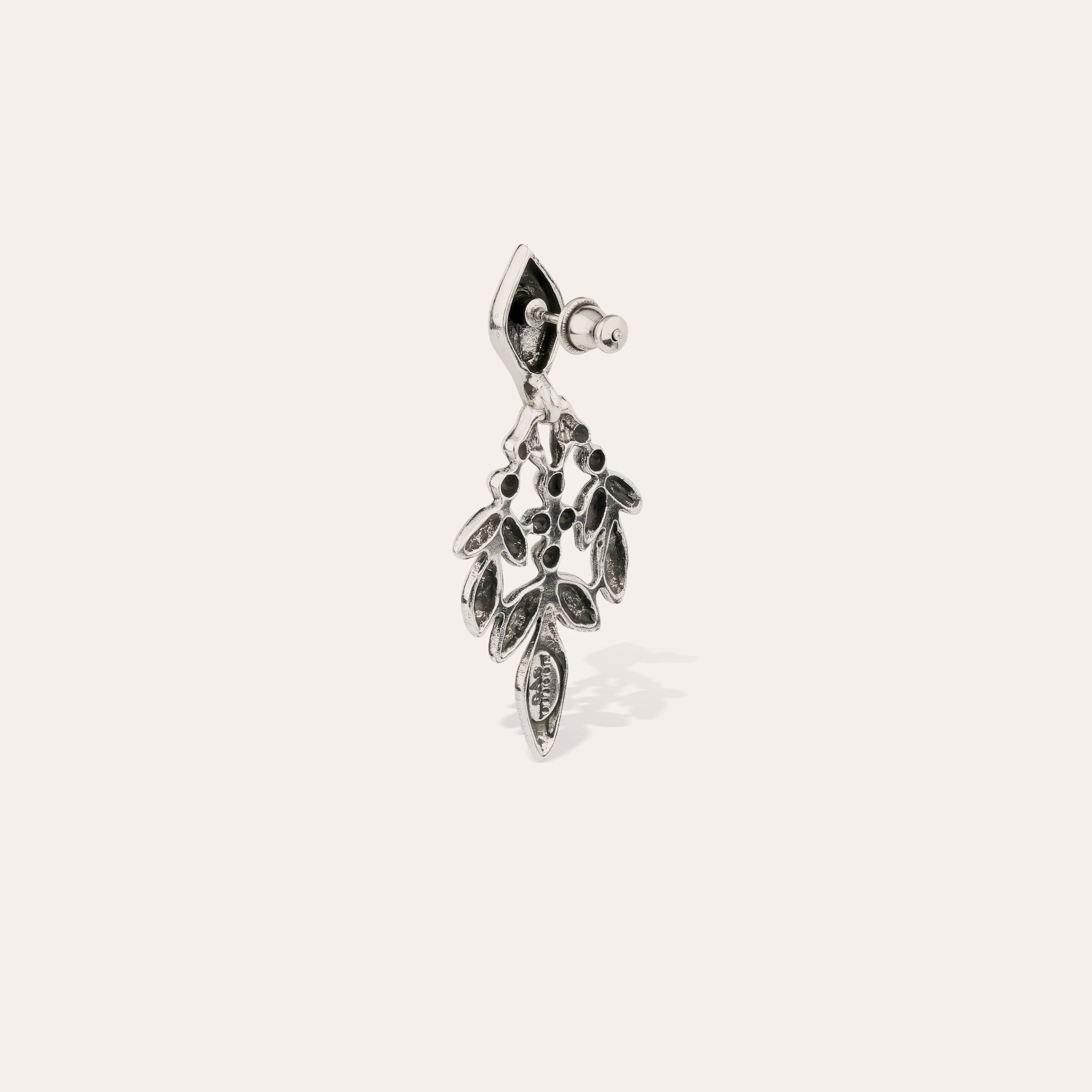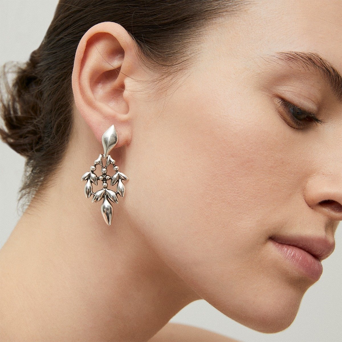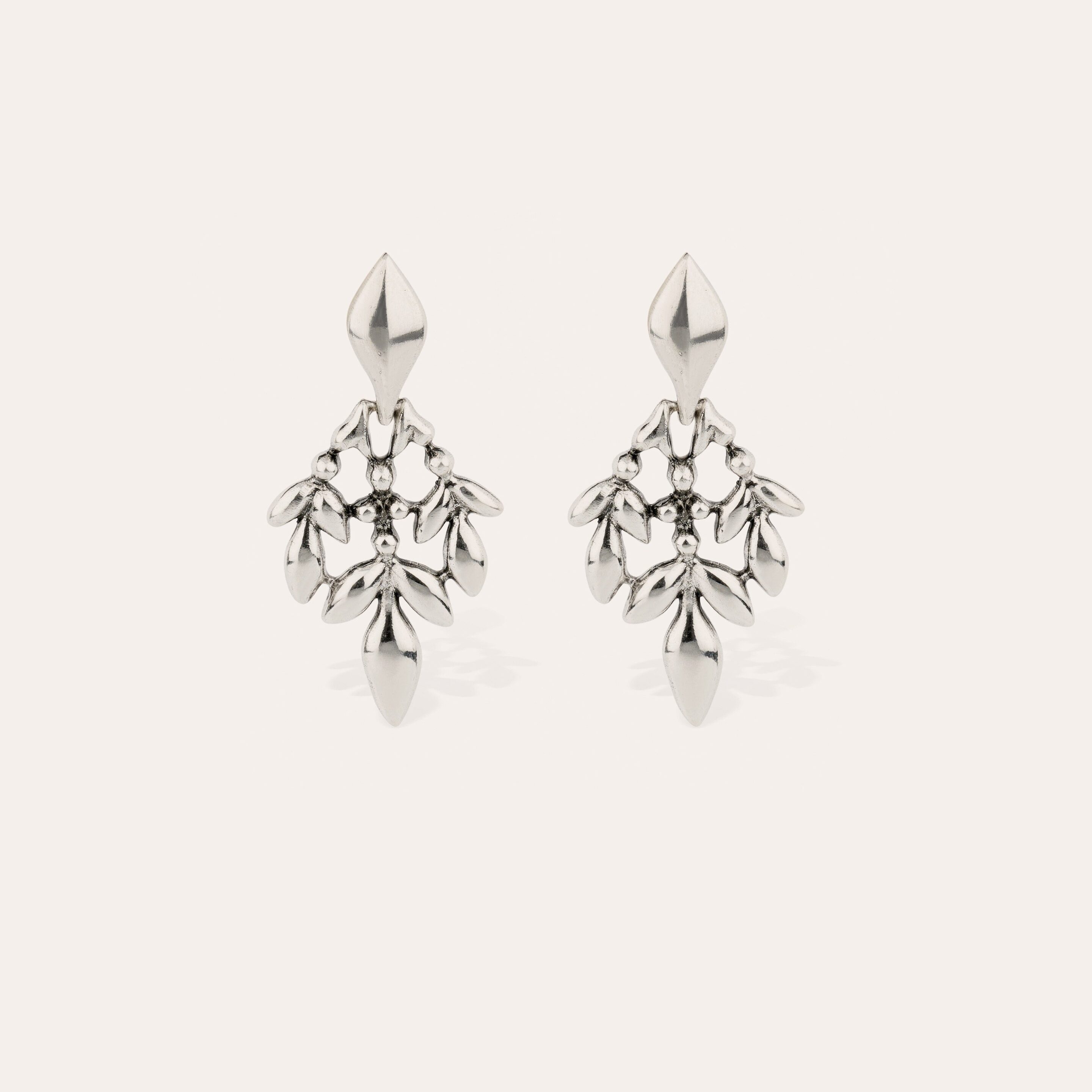 Les boucles d’oreilles Olea argentées s’inspirent de la feuille d’olivier, emblème du Sud. Leur design ajouré en forme de losange évoque un feuillage léger, ponctué de formes rondes rappelant les olives. Chaque boucle se prolonge dans un mouvement fluide, jusqu’à une pointe affirmée.