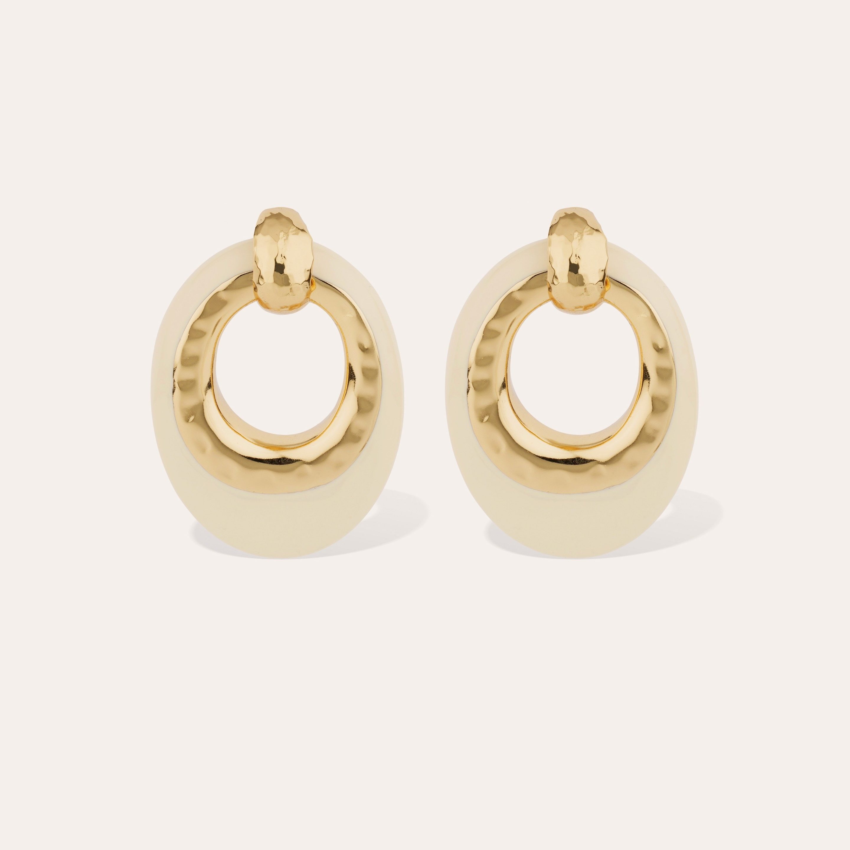 Ces boucles d’oreilles dorées à l’or fin associent un cercle ovale en acétate, issu d’extraits de coton ou de pulpe d’arbre, à un empiècement martelé lumineux. L’acétate révèle ici une couleur unique, chaleureuse, sublimée par une puce martelée. Élégance et artisanat réunis.