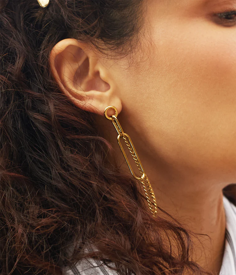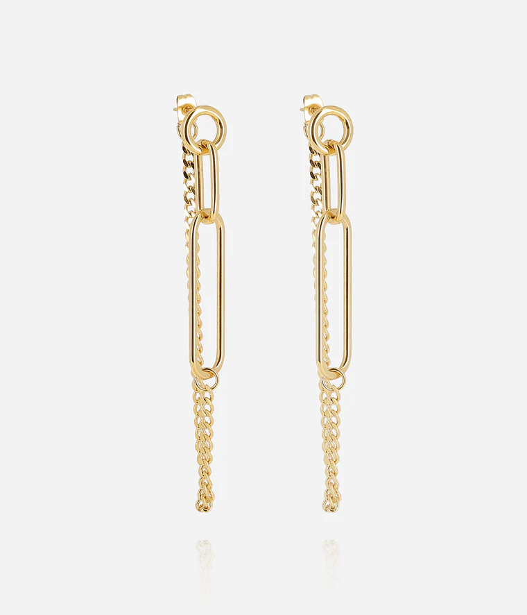 Boucles d’oreilles longues en acier doré à l’or fin par ionisation. Elles sont composées d’un assemblage de chaine et d’empiècements rond et ovale.