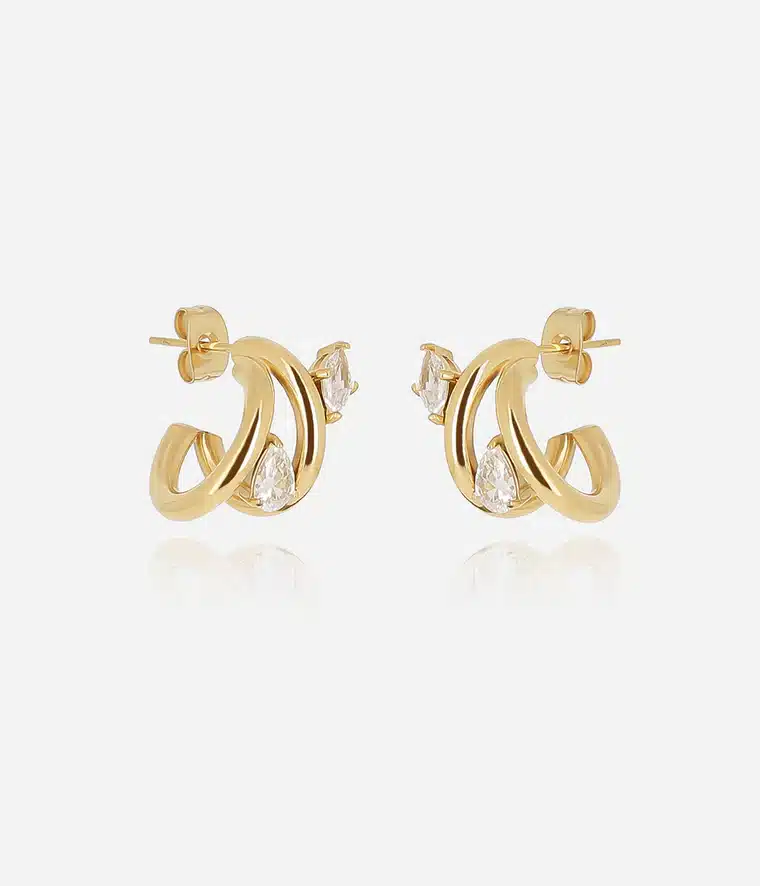 Boucles d’oreilles créoles triple en acier doré à l’or fin par ionisation deux petits zirconiums en forme de goutte et de losange sont sertis sur la créole.