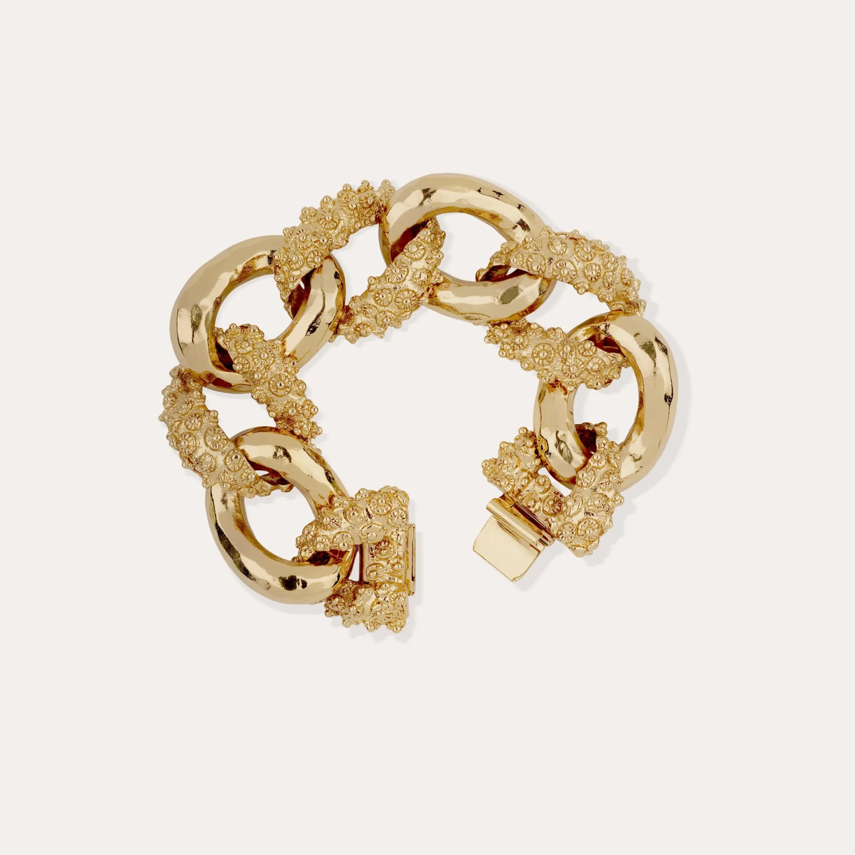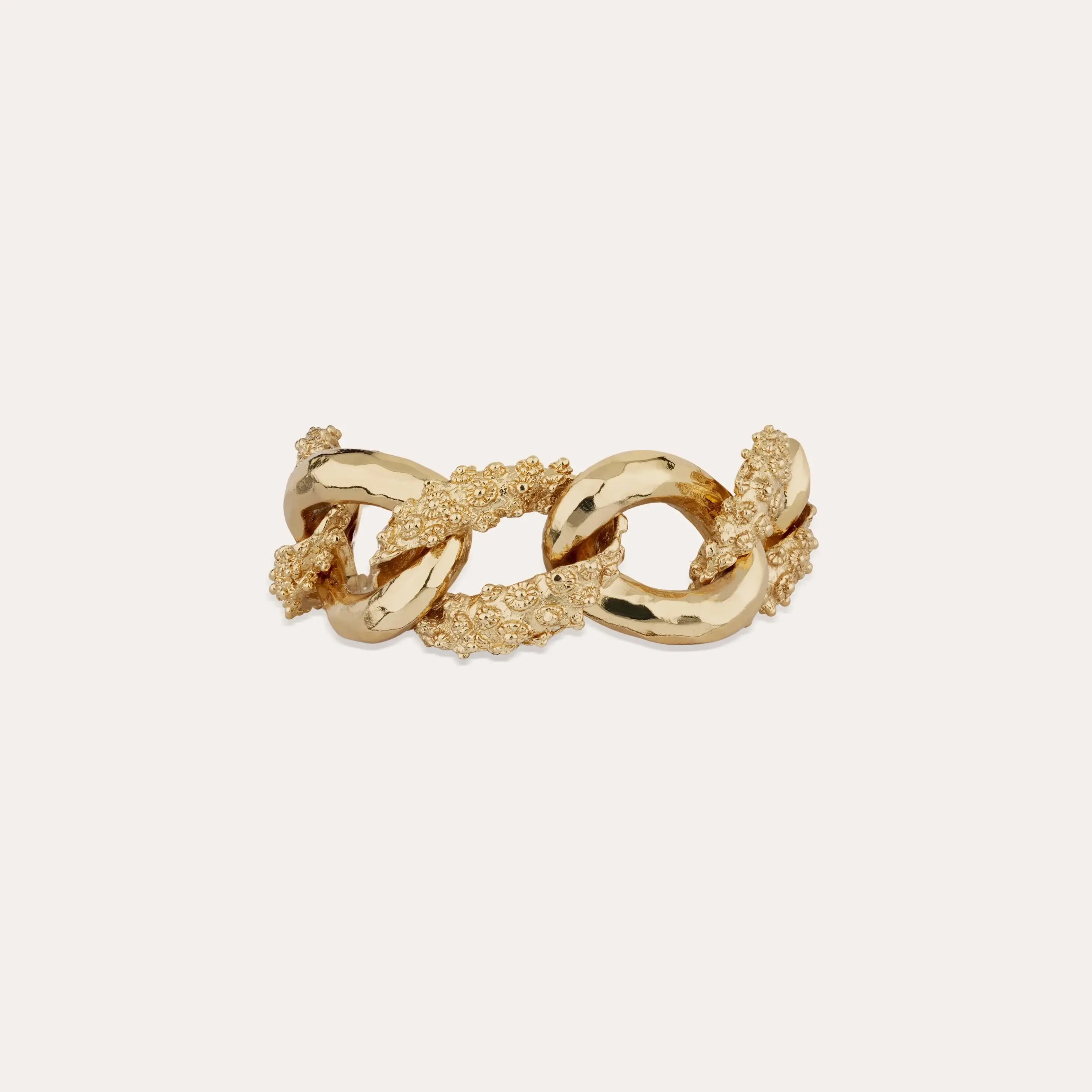 Bracelet chaîne Almara doré à l’or fin, composé d’une succession de maillons aux finitions martelées et texturées. Élégant et structuré, ce bracelet révèle un jeu de reliefs inspiré des roches sculptées par la mer, pour une allure intemporelle et affirmée. Une création artisanale signée Gas Bijoux, façonnée à Marseille.