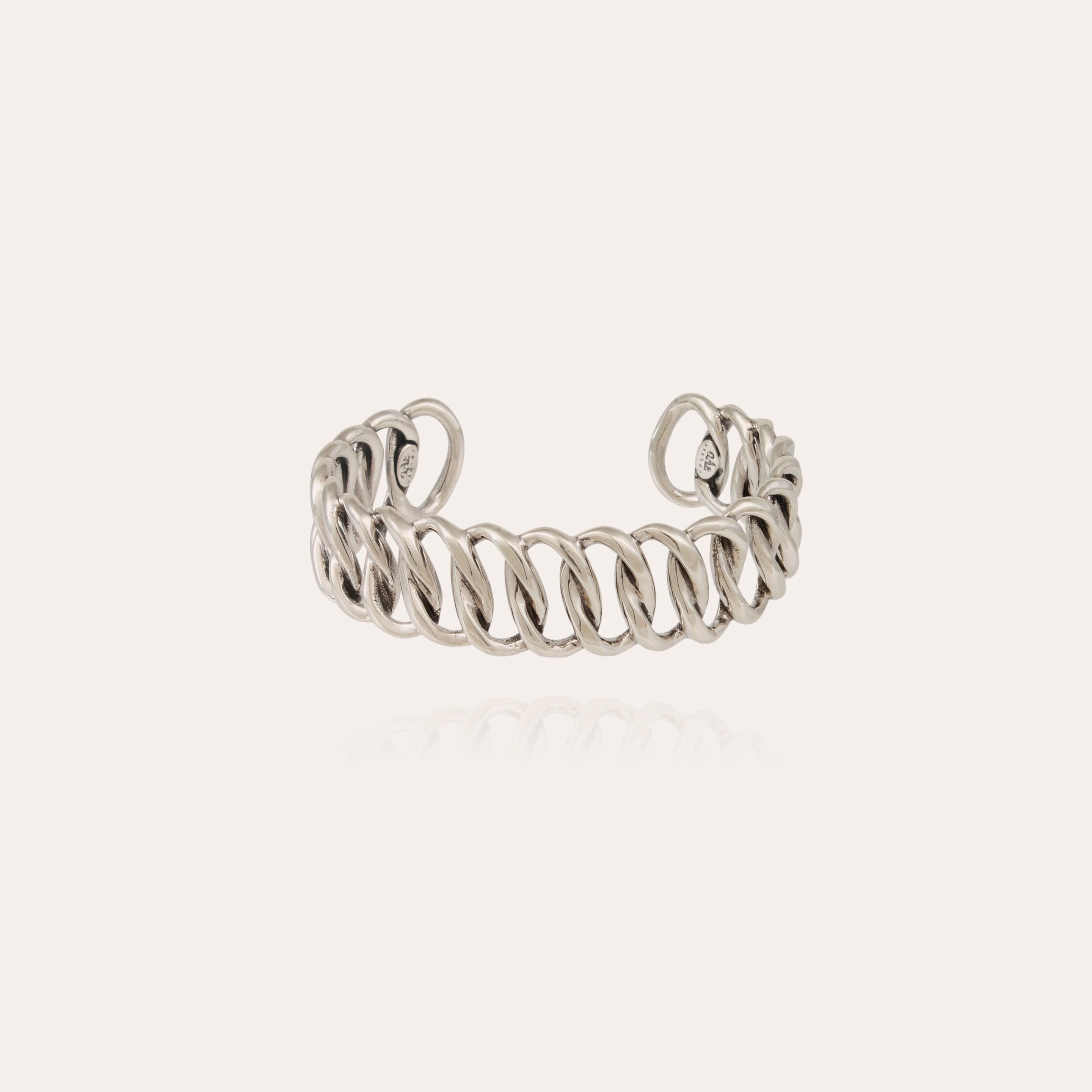 La collection Bronx se compose de pièces affirmées et modernes, revisitant la maille gourmette avec des lignes audacieuses et un éclat métallique intense. Conçue dans notre Maison Atelier, le bracelet Bronx petit modèle argenté, pièce maîtresse d’un style assumé, allie puissance et chic intemporel. Sa taille ajustable assure un porté sur mesure.