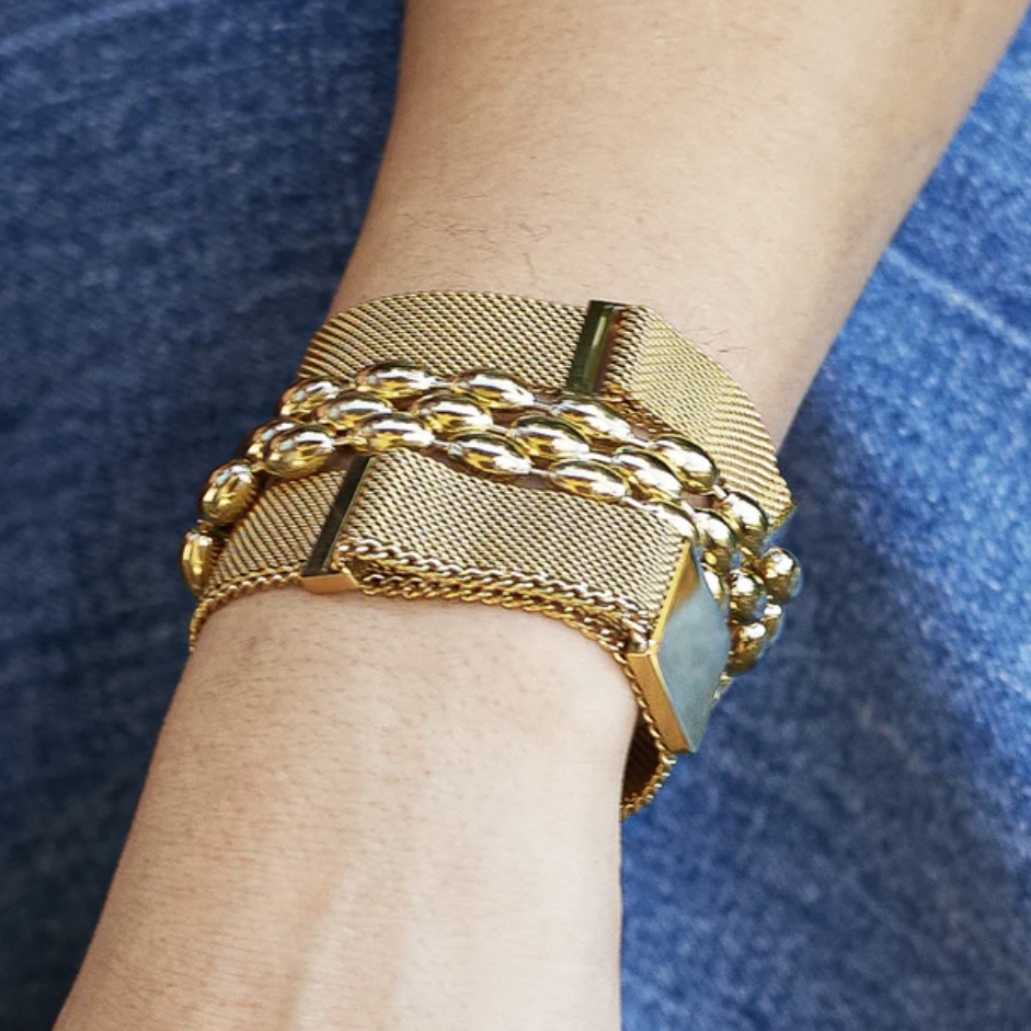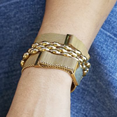 Bracelet large en acier doré à l’or fin en « maille tissu milanais » avec un fermoir aimanté qui se clipse sur la maille du bracelet et s’ajuste ainsi à la taille de votre poignet.