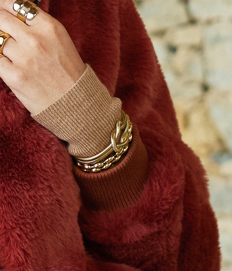 Bracelet multi rangs acier doré à l’or fin par ionisation, composé de plusieurs chaines différentes qui forment un nœud sur le dessus