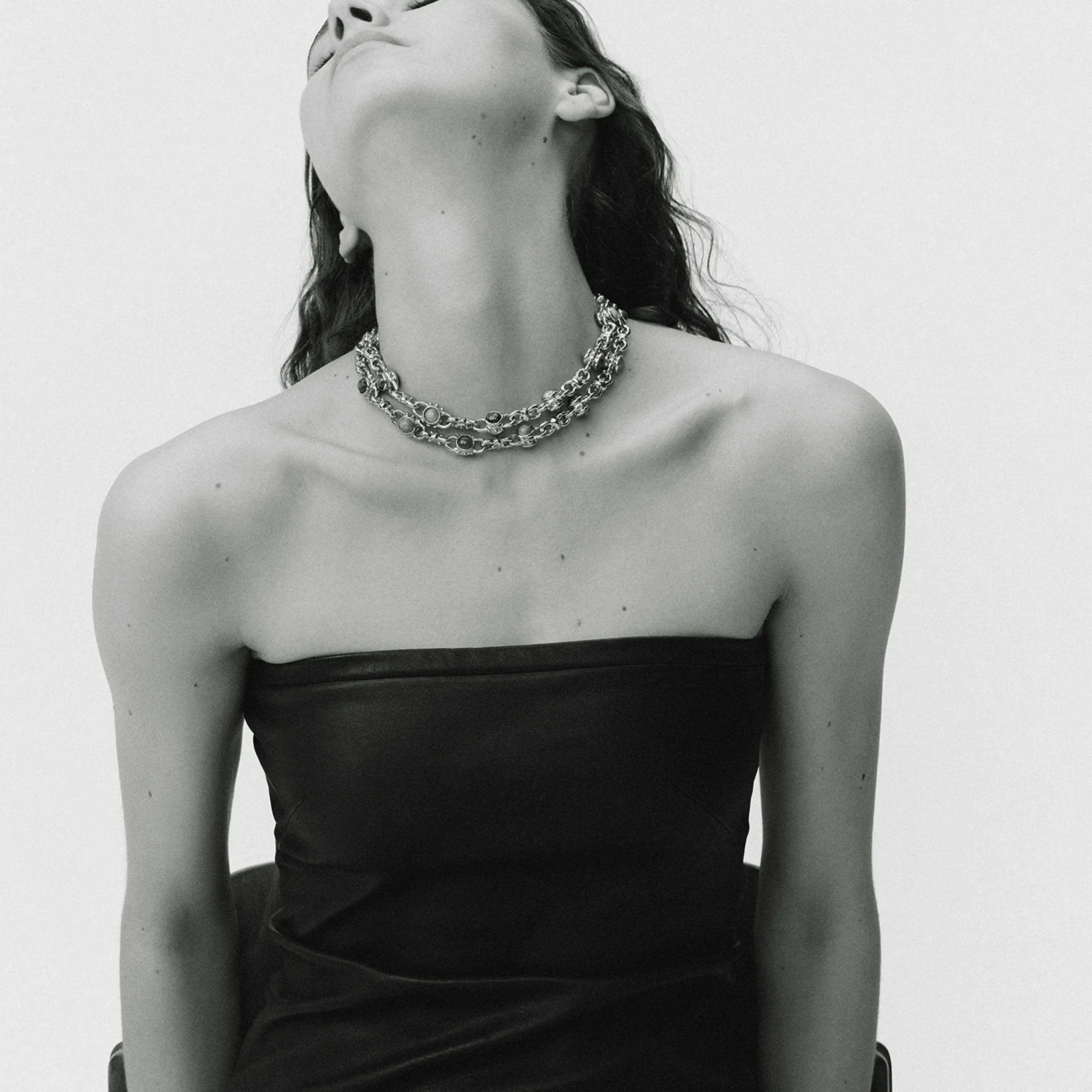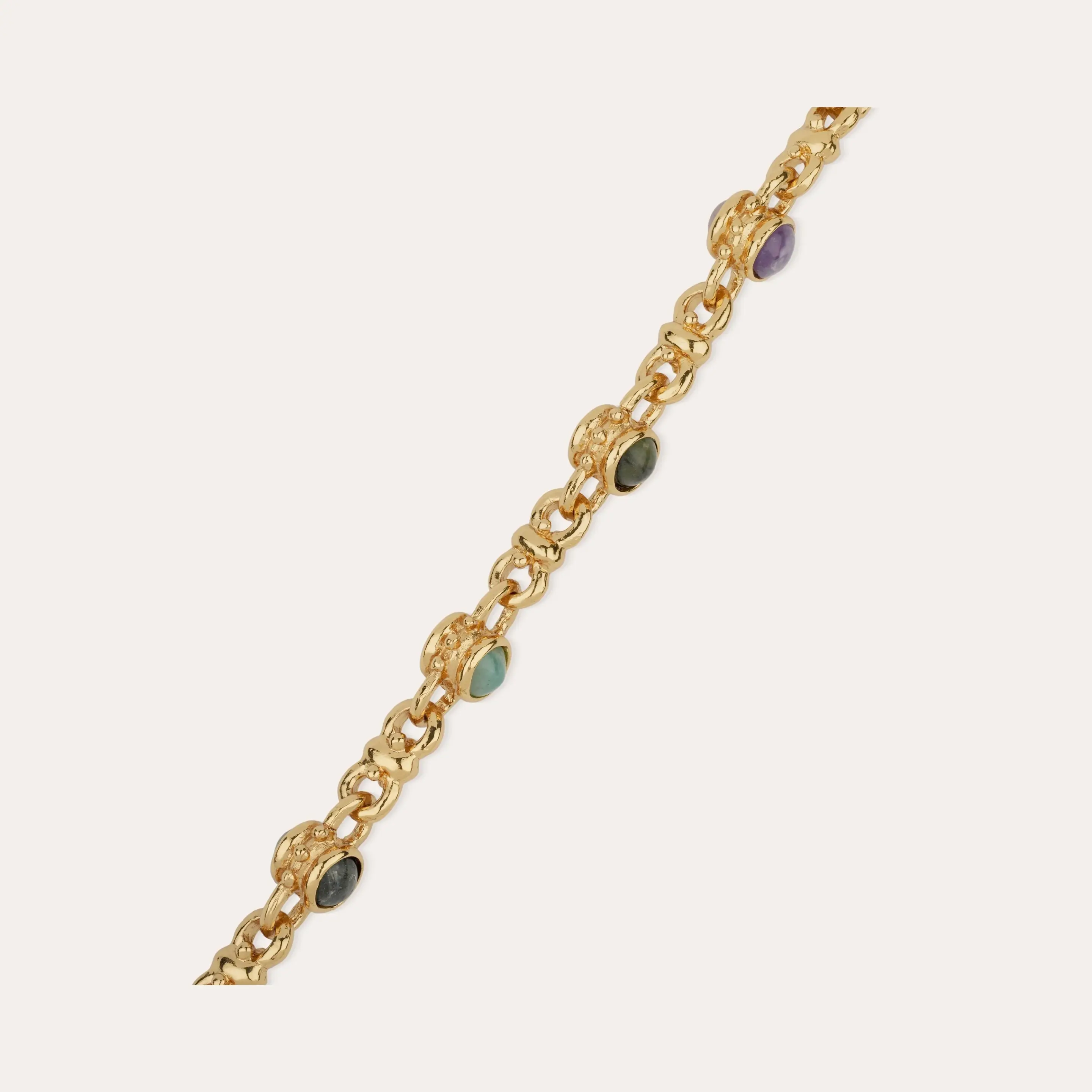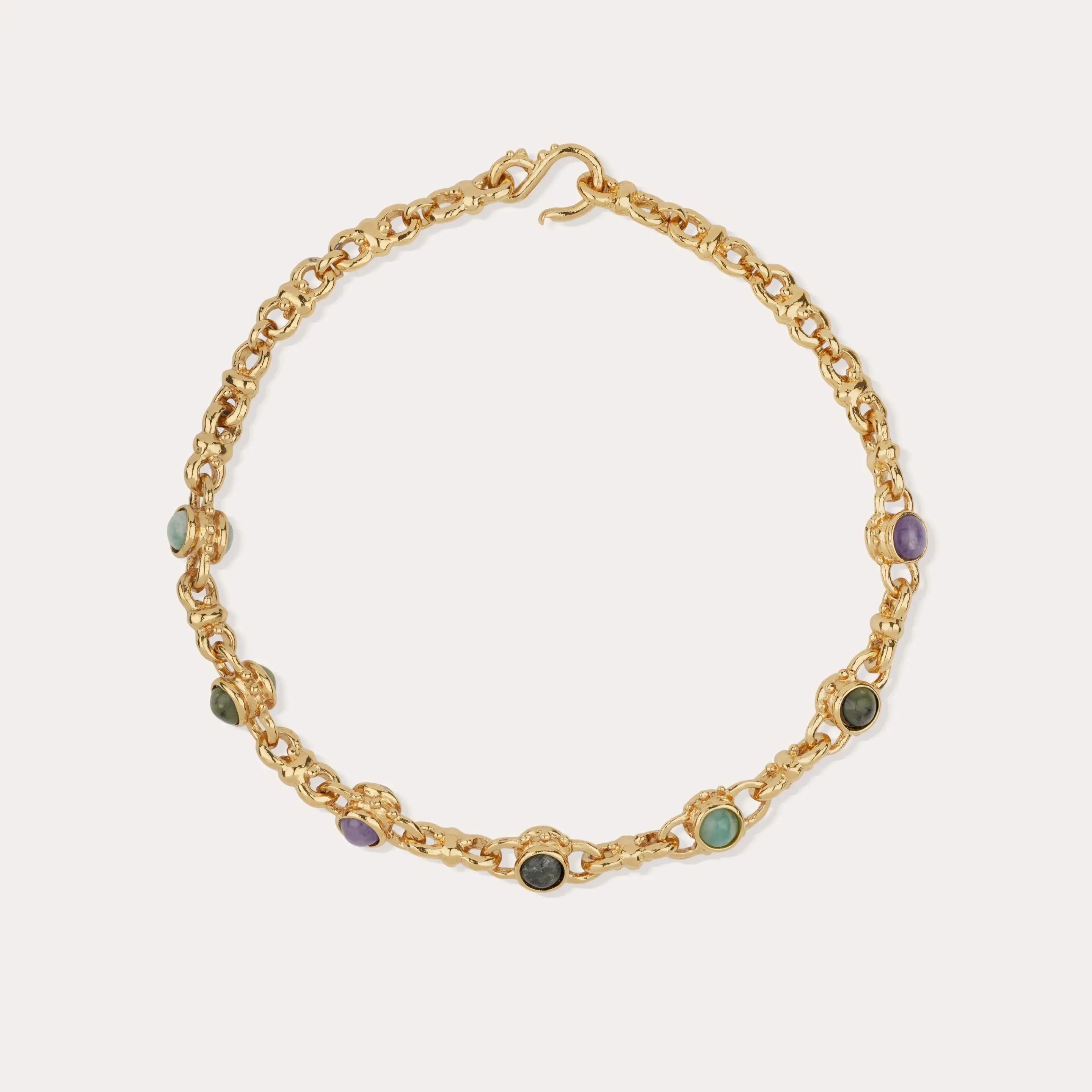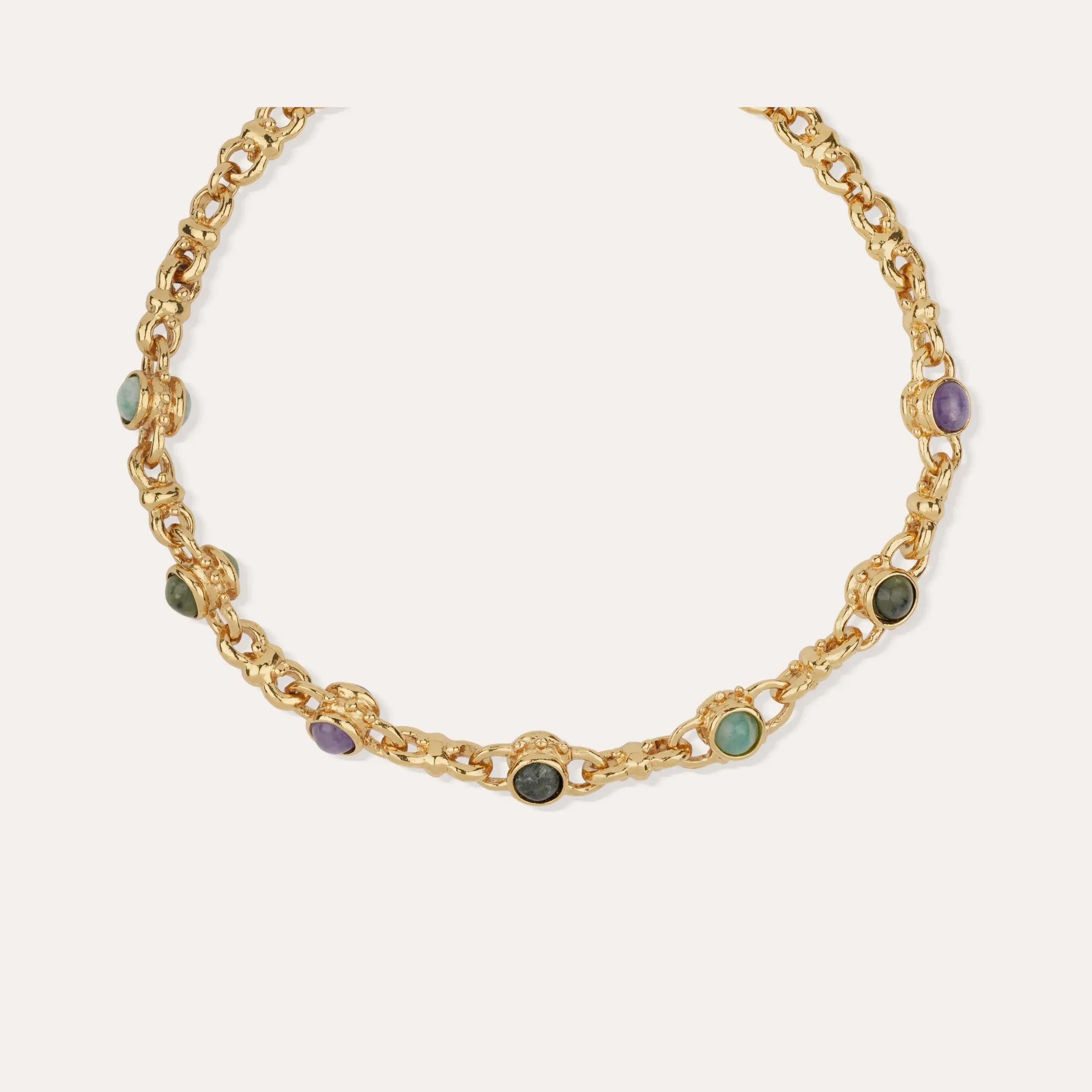 Bijou signature de la nouvelle collection de la Maison Gas Bijoux, le collier Amarante est une pièce d’exception à l’esprit vintage, inspirée des fastes de l’art byzantin. Façonné à la main dans notre historique Maison Atelier à Marseille, ce collier doré à l’or fin révèle des cabochons d’Améthyste, Amazonite, Vesonite et Jaspe vert soigneusement polis, qui captent la lumière avec intensité. Chaque pierre fine, taillée avec minutie, sublime la structure de maillons dorés du bijou et dévoile un éclat solaire unique à chaque mouvement. Entre tradition et modernité, ce collier artisanal illustre le savoir-faire intemporel de Gas Bijoux : un bijou lumineux et sculptural, pensé comme un joyau d’architecture à porter en toute élégance.