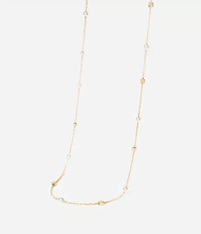 Collier en acier doré à l’or fin par ionisation serti de perles en acier et de perles.