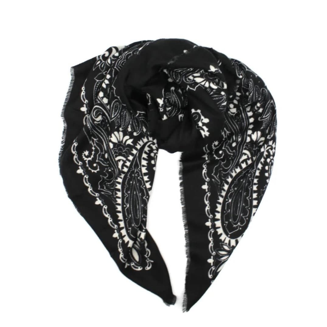 Carré avec imprimé « Bandana » en 100% polyester. Toucher très doux. Ultra tendance pour l’hiver avec son imprimé « bandana », vous pourrez l’associer facilement à vos tenues d ‘automne.